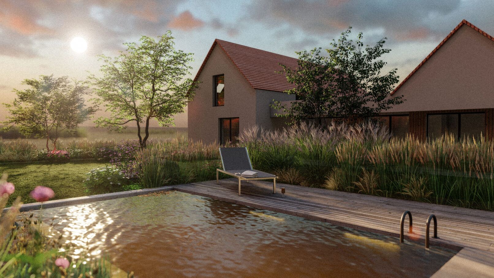Velký rovný pozemek se citlivým členěním proměnil na příjemnou zahradu s mnoha rozmanitými zákoutími a průhledy. Před vstupem vzniká intimní prostor malého dvorku s průhledem skrz dům a přes rozlehlou terasu do zahrady. Jak je v kraji rybníků dobrým zvykem, i v této zahradě se objevuje voda v různých podobách. Pobytové zahradě dominuje koupací biotop a vodní ochlazovací prvek je také ve wellness zóně.