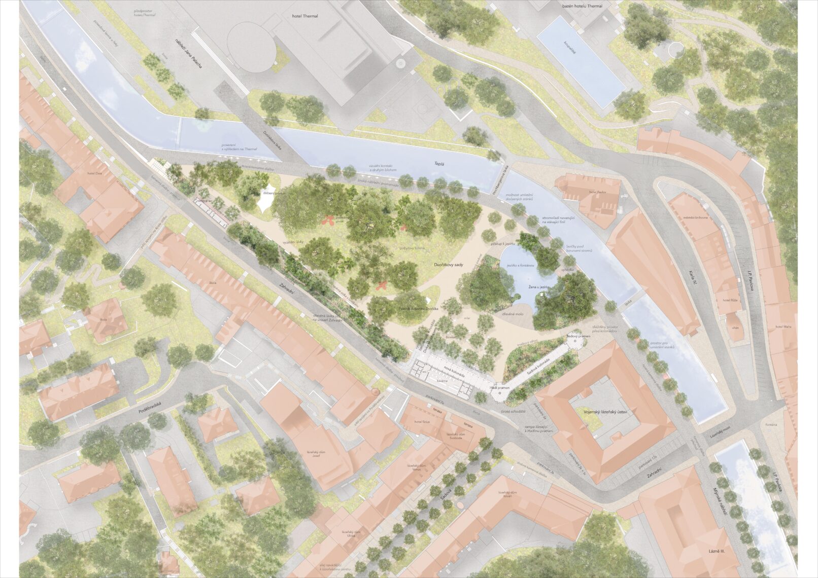 Dvořákovy sady jsou významným lázeňským parkem na karlovarské lázeňské promenádě v těsné blízkosti ikonického hotelu Thermal. Kráčela tudy nejen historie, ale i mnoho filmových hvězd a každé období zanechalo v parku významné stopy. Vytržené z kontextu a bez jasných návazností jsou čitelné dodnes. V návrhu je tyto stopy citlivě sjednocujeme do harmonického a funkčního celku. Vzniká nový veřejný prostor, který ctí genia loci a zároveň plně odpovídá současným provozním potřebám lázeňského parku.