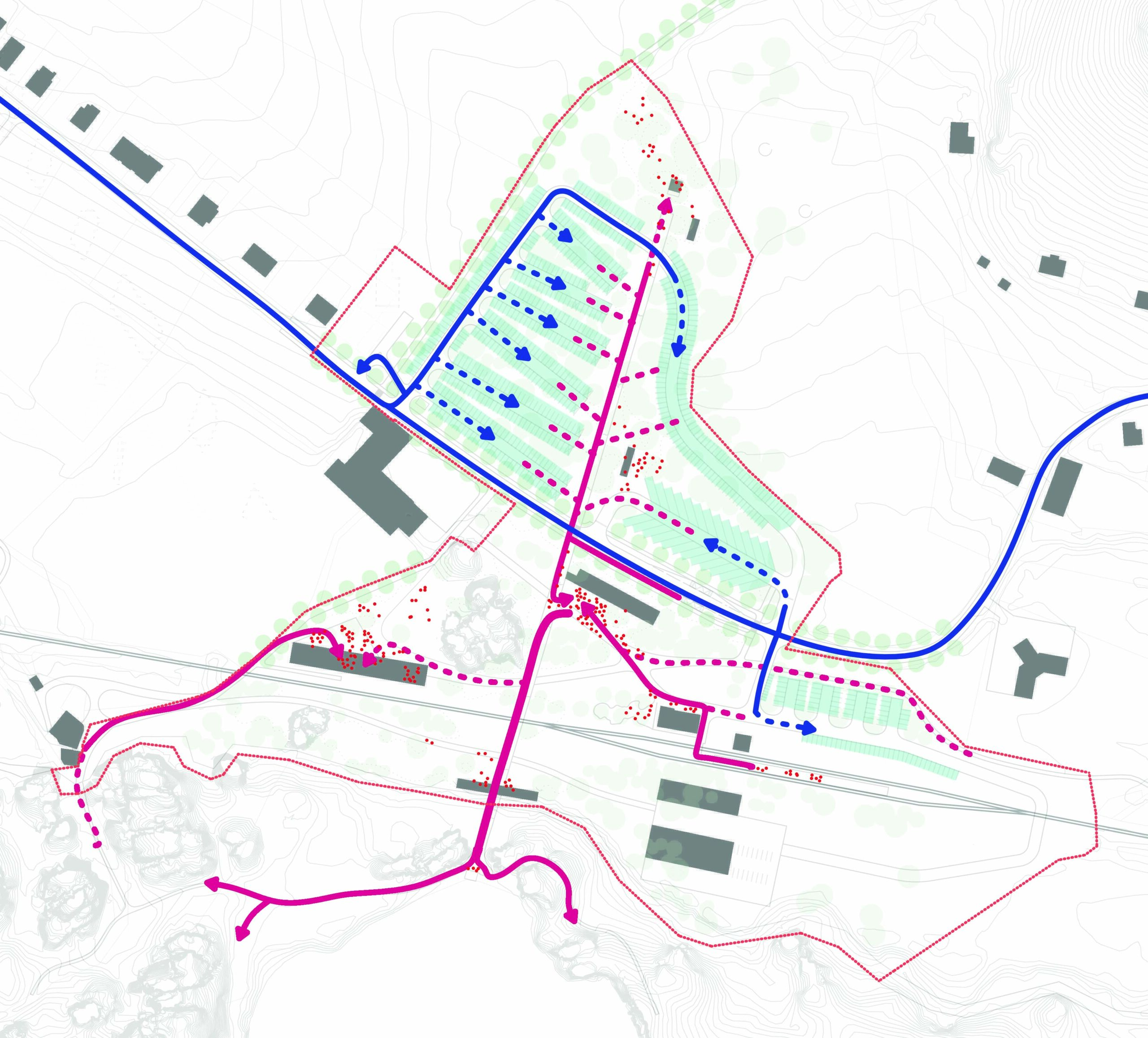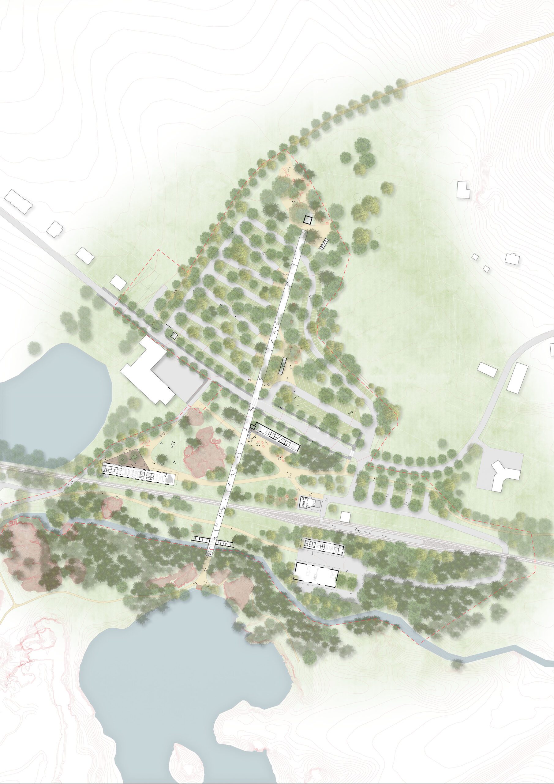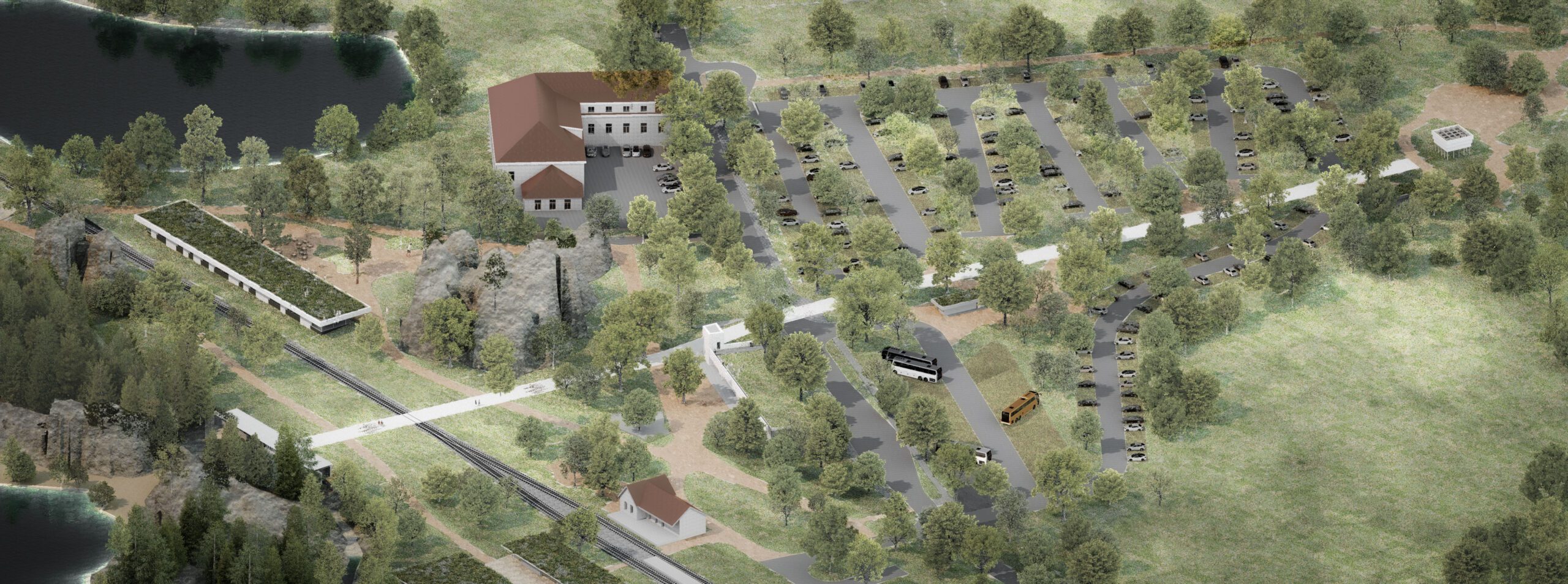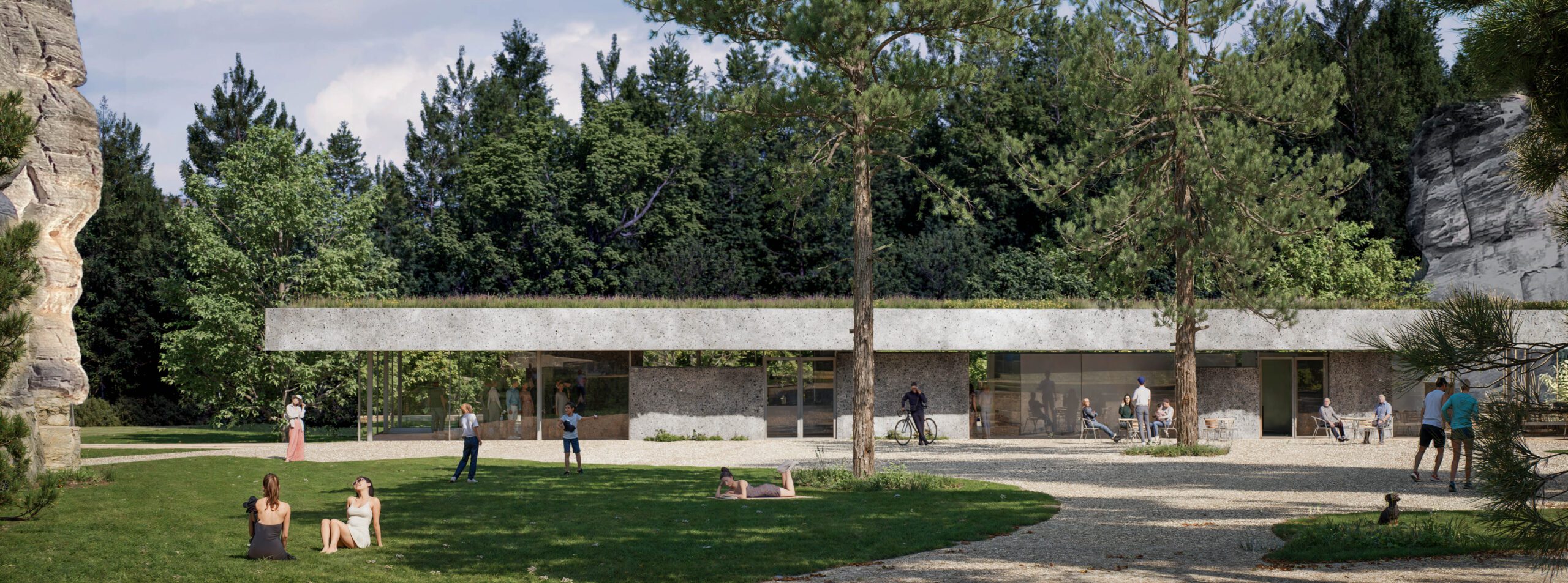 Adršpašské skály patří mezi nejnavštěvovanější přírodní památky Česka. Návštěvníci sem přicházejí s velkým očekáváním – a právě návrh vstupního areálu by měl toto očekávání zpříjemnit. Chceme vytvořit prostor, který zvládne extrémní návštěvnickou zátěž a zároveň podpoří fenomén adršpašských skal. Navrhli jsme přehlednou pěší trasu, kterou návštěvníci intuitivně sledují od parkoviště přes návštěvnické centrum až k samotnému vstupu do skal – bez stresu, front ani provozních kolizí. Naším cílem je vrátit místu jeho původní lesní charakter. Navrhli jsme nízké budovy s vegetačními střechami a minimalistickým designem. Záměrně jsme je umístili tak, aby se vzdalovaly od velkolepých skalních útvarů a zároveň odhalovaly atraktivní výhledy. Tím se náš návrh vstupního areálu spojuje s přírodou – zůstává funkční a nenápadný.