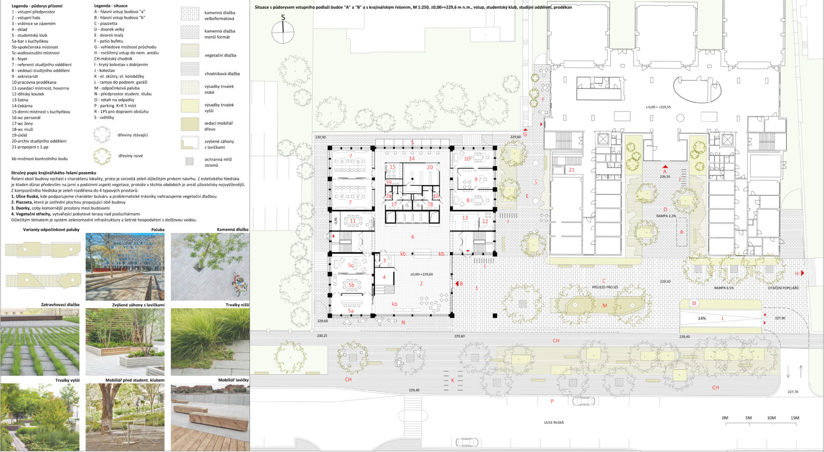 Pohybujeme se v lokalitě, kde byla historicky hojně zastoupena zeleň a jednotlivé objekty působily jako pavilony v zahradě. Podstatným hlediskem návrhu je, aby tento charakter místa zůstal v patřičné míře zachován, a to platí i pro krajinářské řešení.