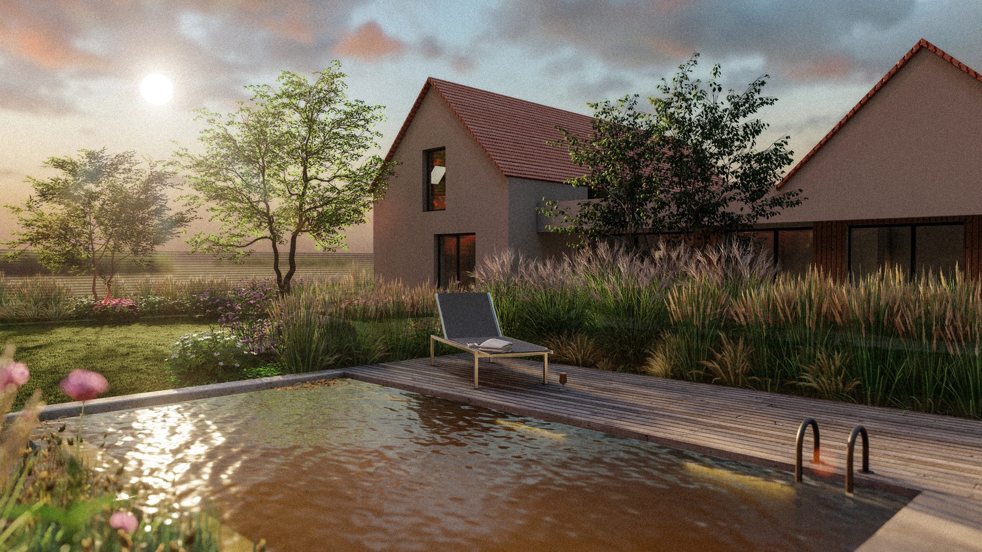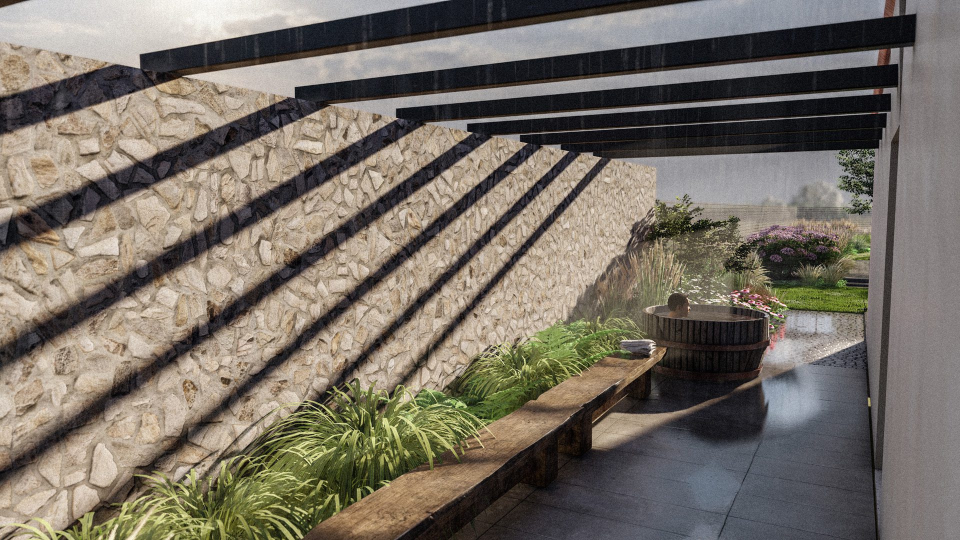 Protože se zahrada nachází v kraji rybníků, nechybí zde ani voda v různých podobách. Koupací biotop tvoří přirozené centrum pobytové části, kde se voda stává živým prvkem a láká k osvěžení. Ve wellness zóně jsme doplnili i vodní ochlazovací prvek, který podporuje relaxaci a umocňuje klidnou atmosféru.