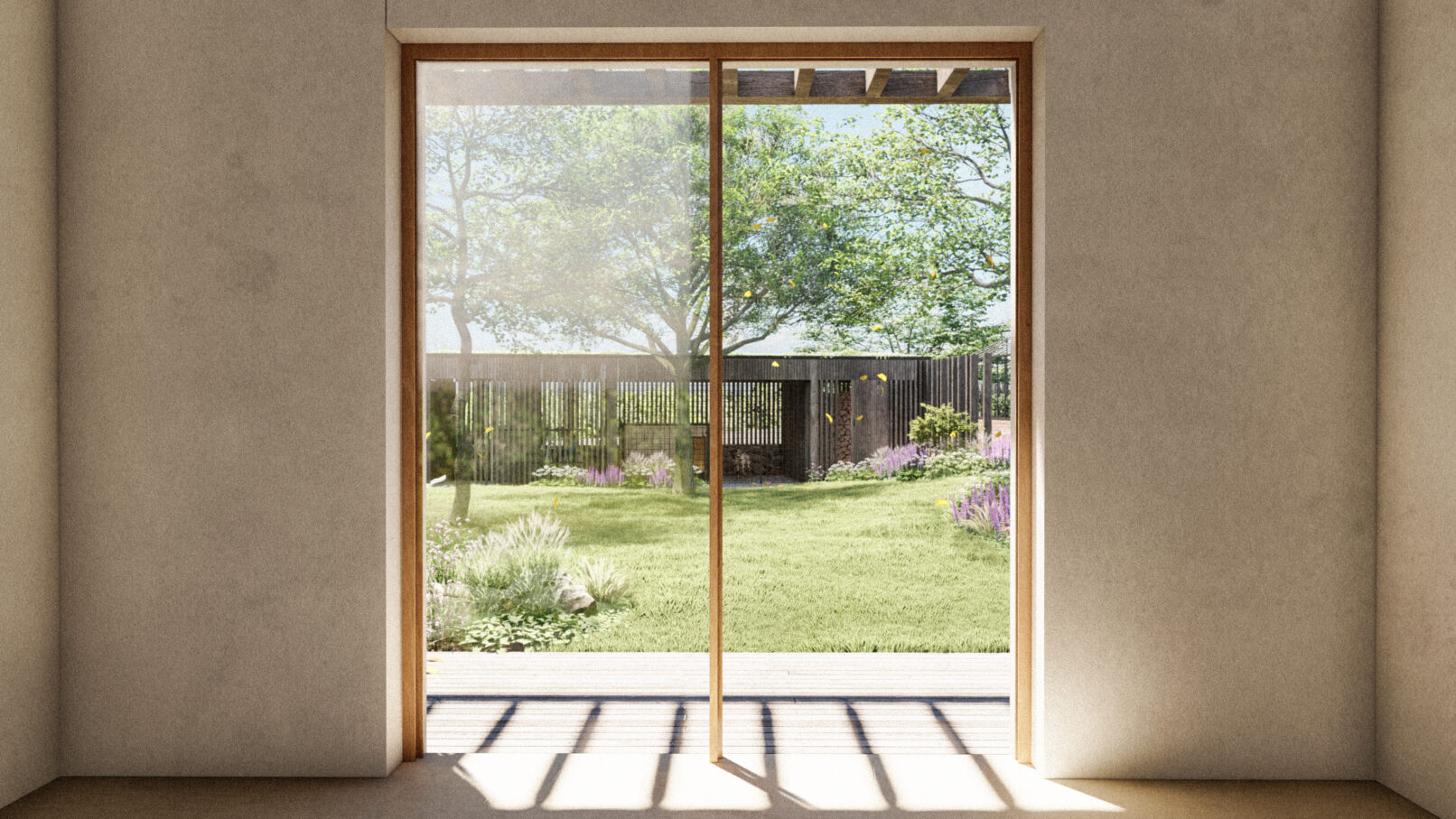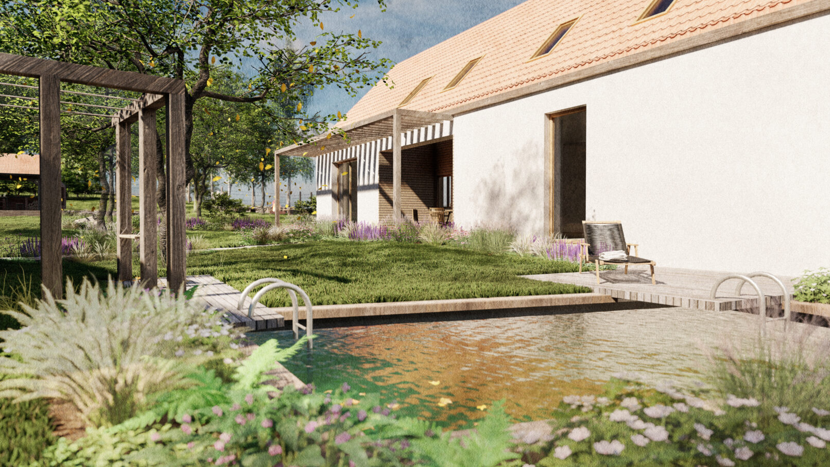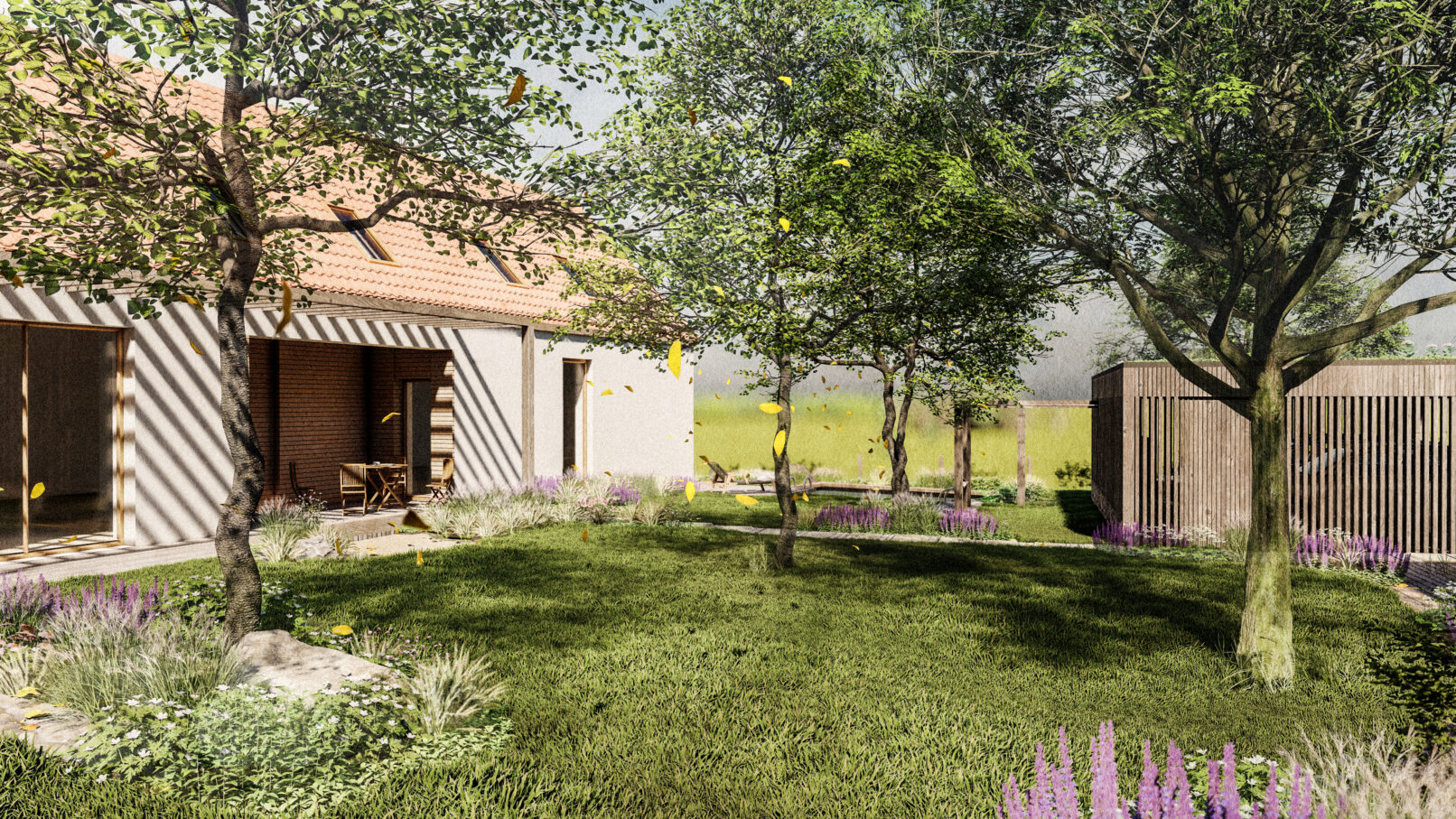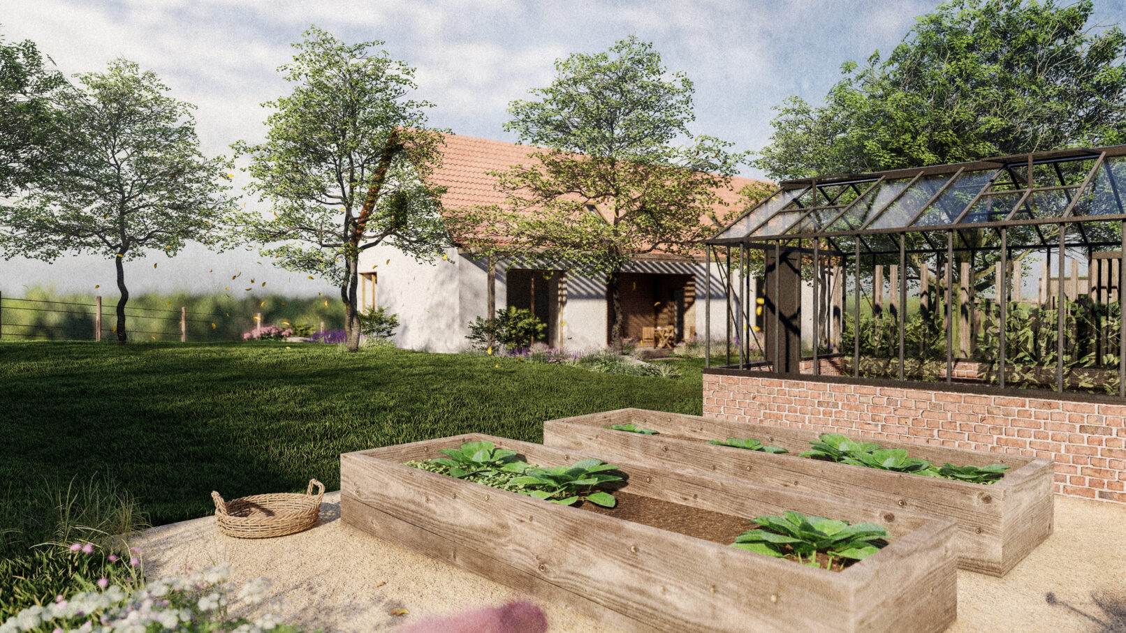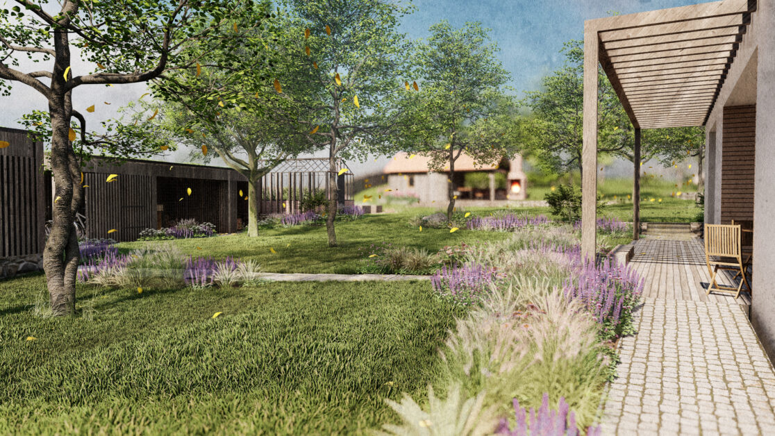 Novostavba rodinného domu na jihočeském venkově svou podobou vychází z typických místních chalup a stejně tak i zahrada s plaňkovým plotem. Plná ovocných stromů a záhonů na kamenných zídkách.