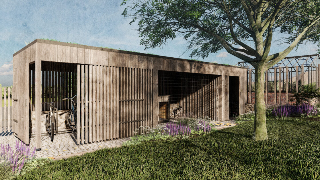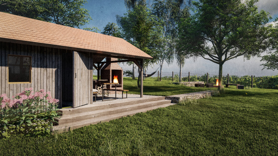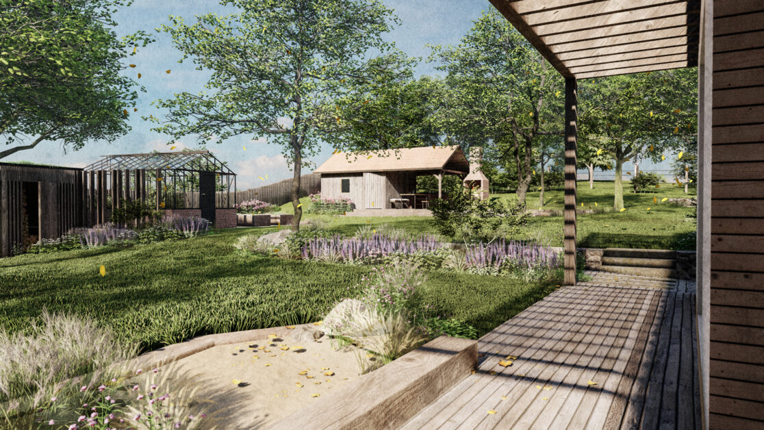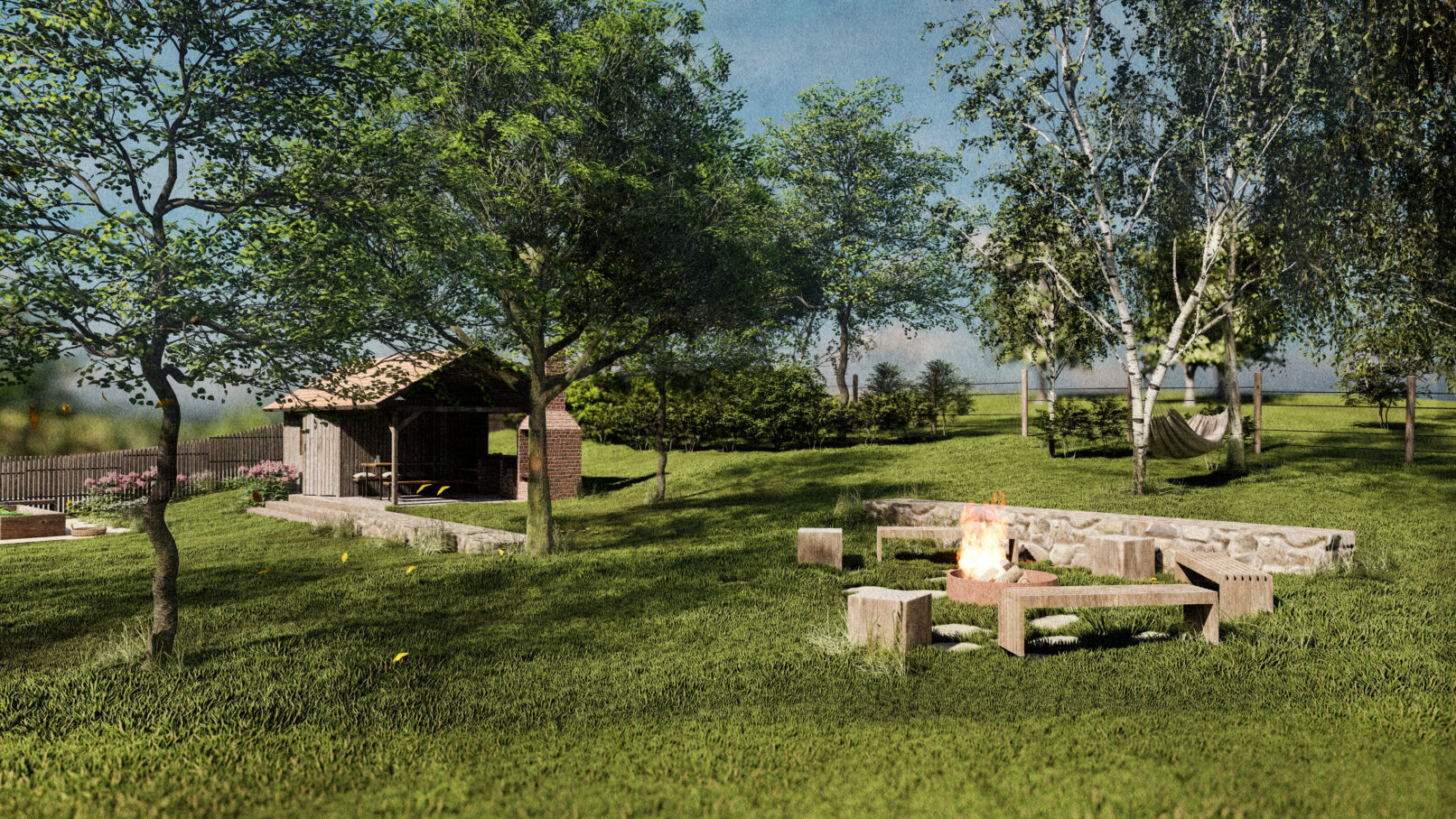 Zahrada pro mladou rodinu se vším co k venkovské idylce patří. Pořádně velká kůlna se zelenou střechou, ohniště, koupání a nekonečné výhledy do krajiny.