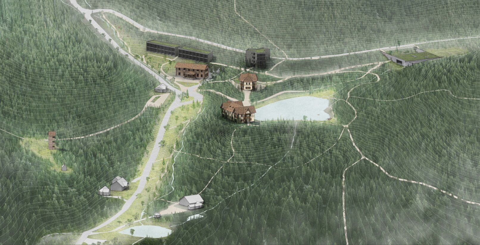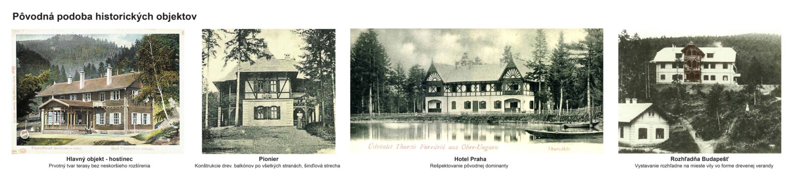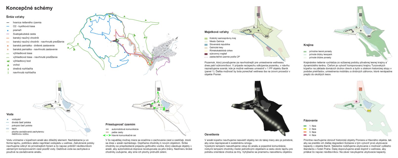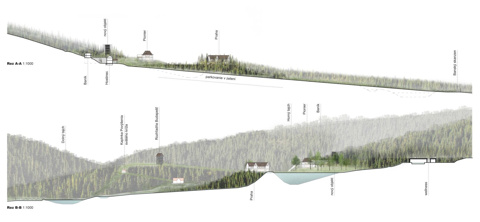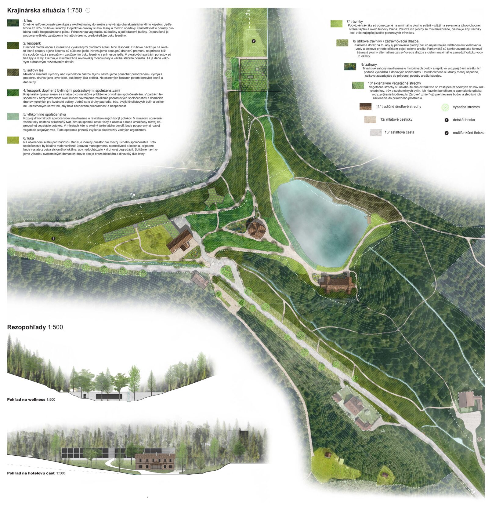 Kdysi věhlasné Turzovské kúpele se nacházejí v lesnatých kopcích Volovských vrchů na východním Slovensku, v místech, kde byla krajina po staletí formována důlní činností. V rámci odvodňovacího systému těžebních štol zde byla zbudována dvě umělá jezera – dnešní Horní a Dolní tajch. Těžba v oblasti postupně stagnovala, až do druhé poloviny 19. století, kdy bylo území okolo Horního tajchu proměněno v lázeňský areál. Krajinářské řešení vychází ze stávající podoby půvabné lesní krajiny a dynamického terénu. Důležitým tématem celého řešení je udržitelnost a dlouhodobá perspektiva lesních porostů, které jsou nositelem atmosféry celého areálu.