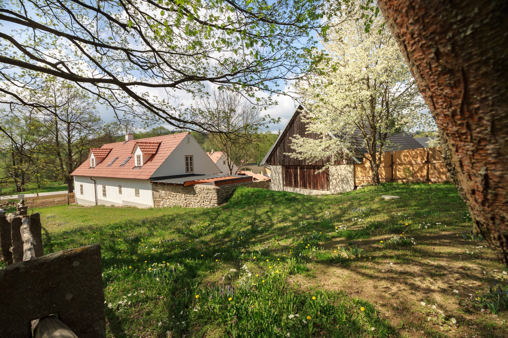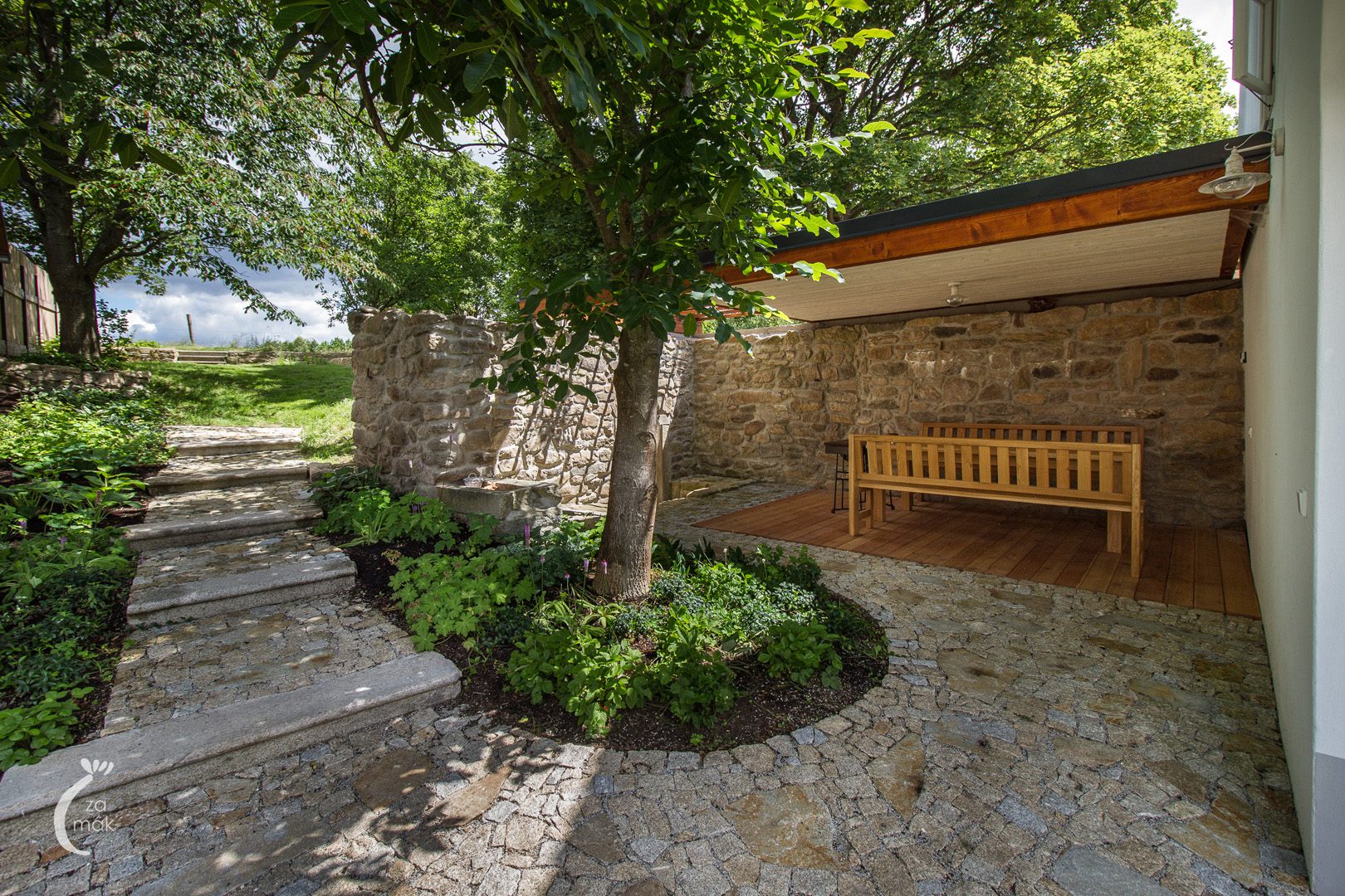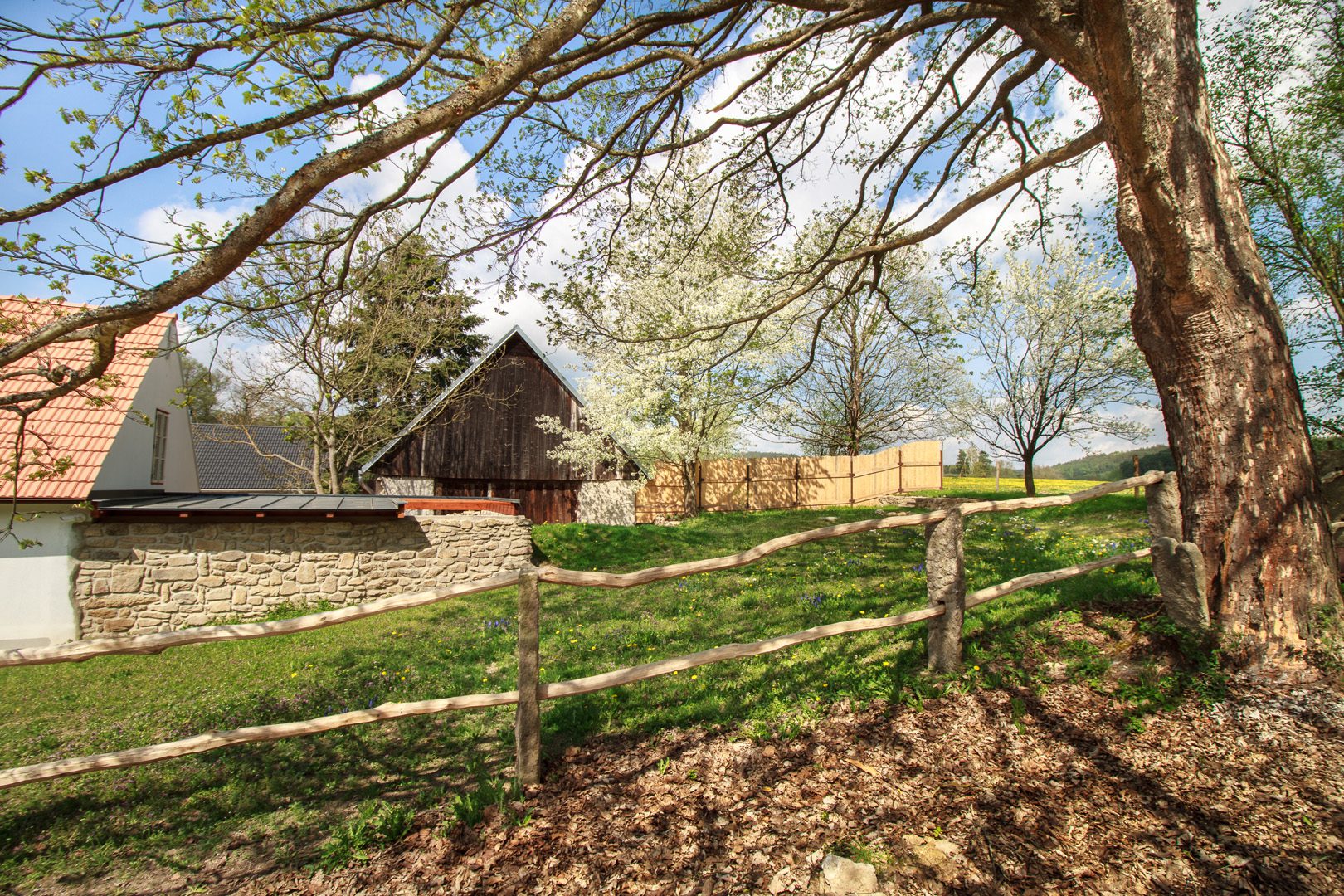 Záhumenka s ohništěm, bylinky a několik ovocných stromů doplňuje kompozici, kterou uzavírá statný javor. Výhledy do krajiny se rozprostírají za tradiční ohradou z kamene a akátového dřeva.