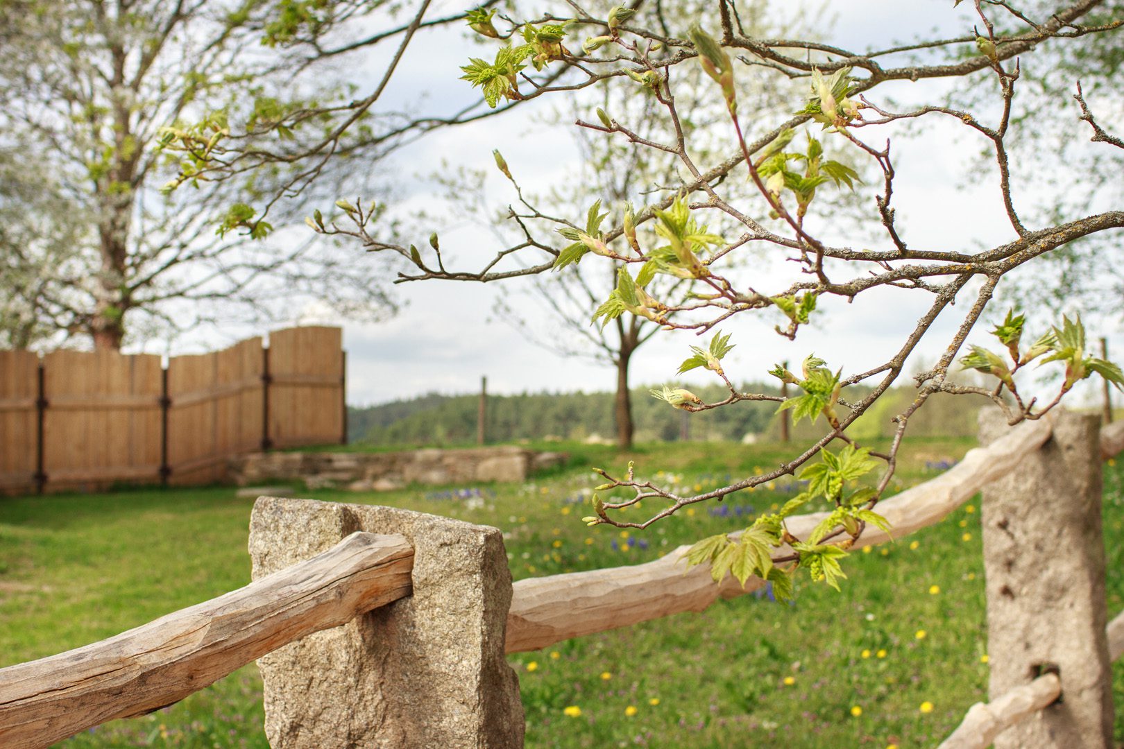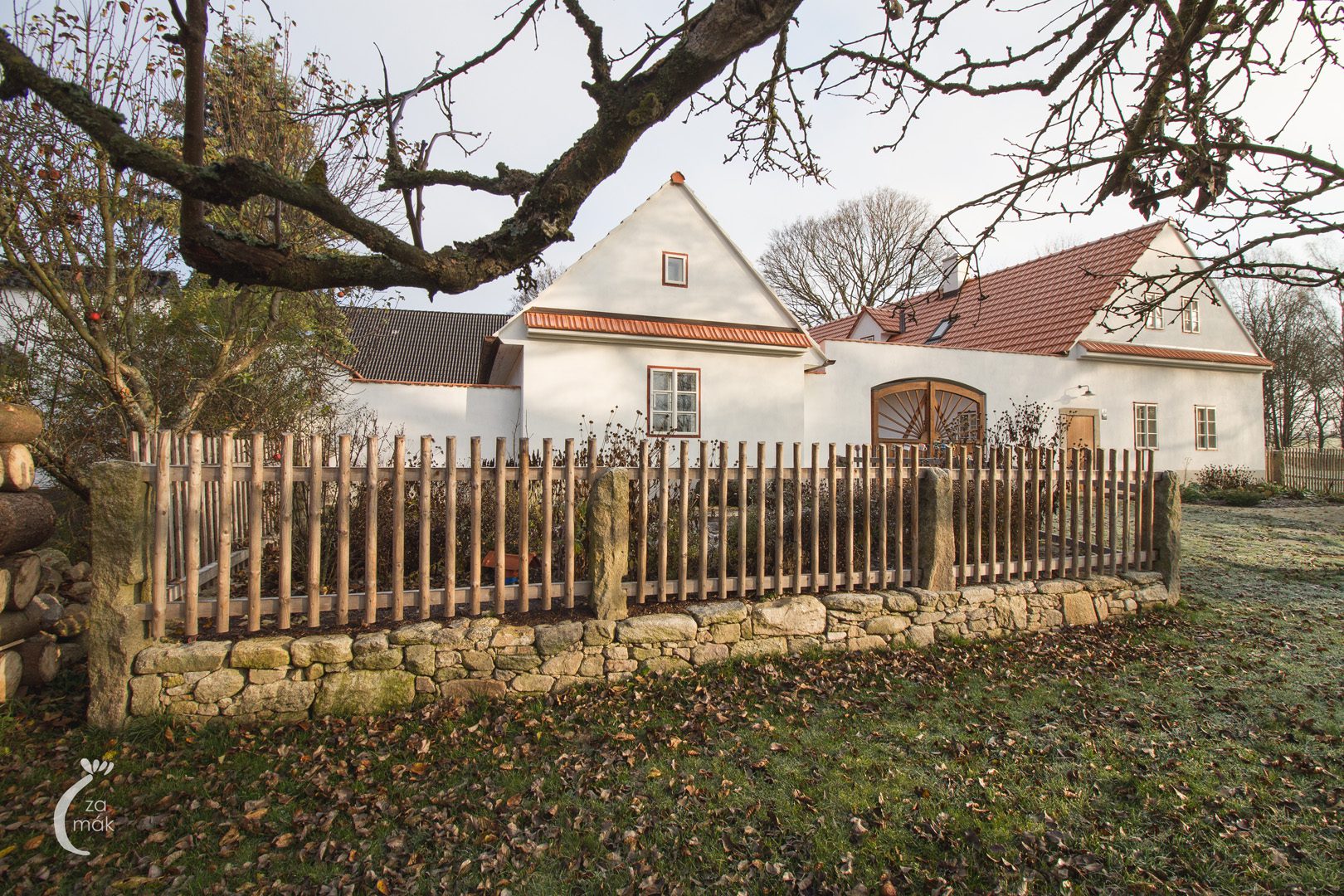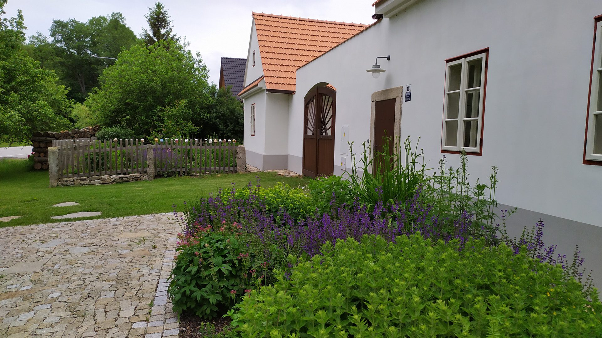Záhumenka s ohništěm, bylinky a několik ovocných stromů doplňuje kompozici, kterou uzavírá statný javor. Výhledy do krajiny se rozprostírají za tradiční ohradou z kamene a akátového dřeva.