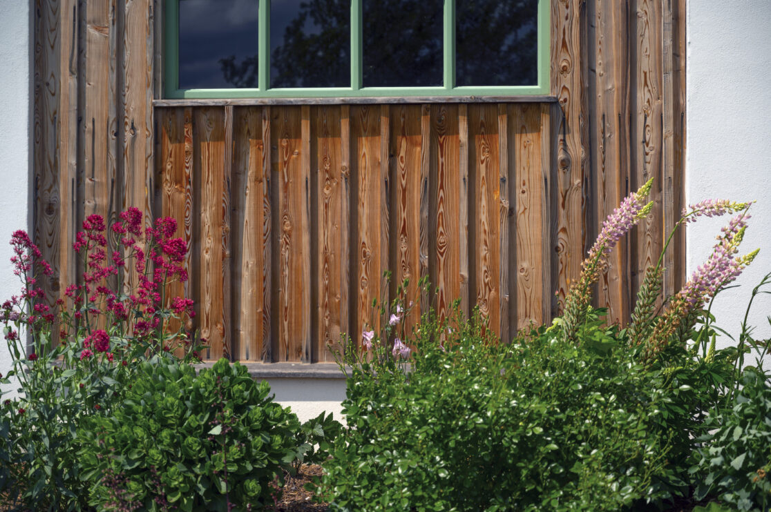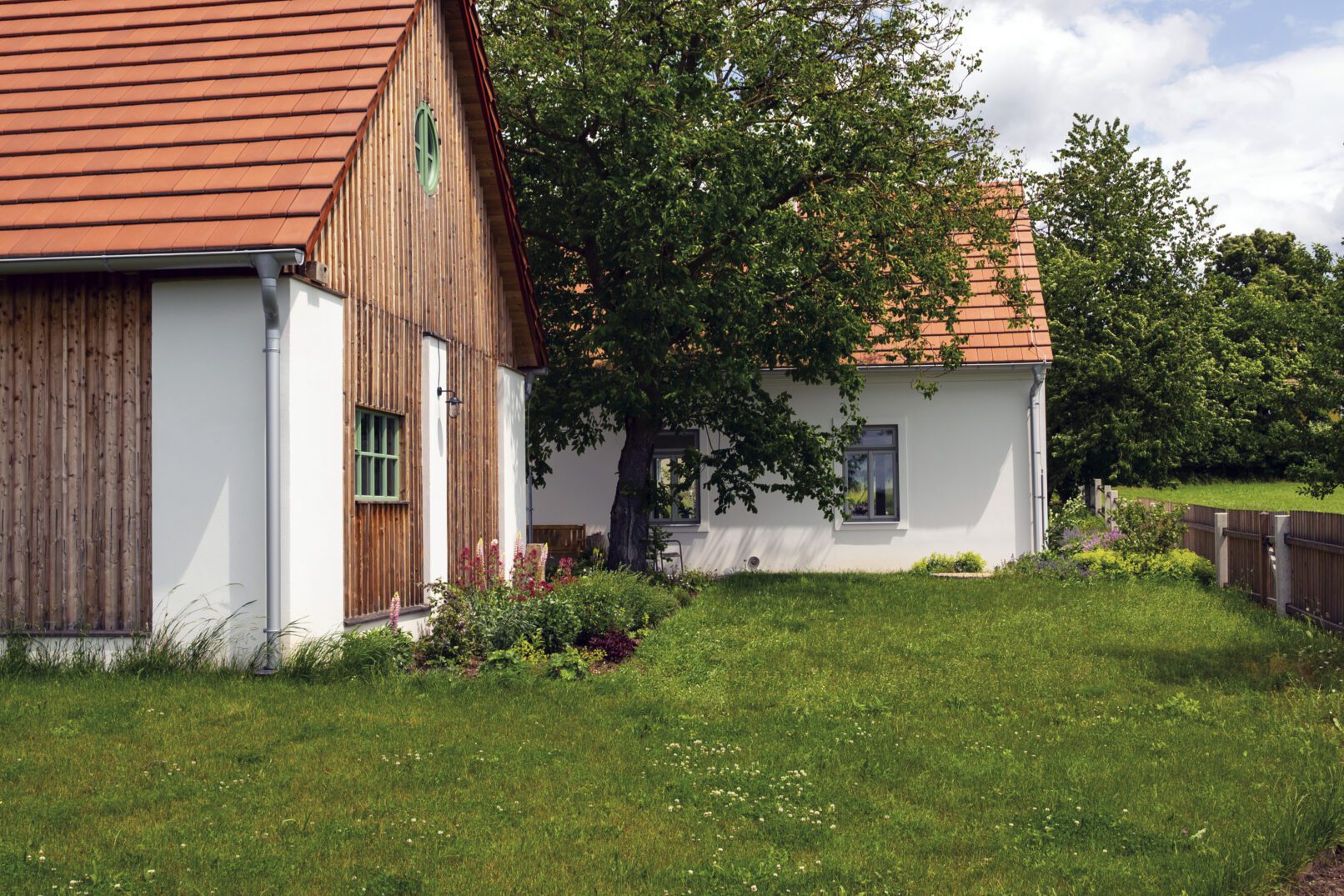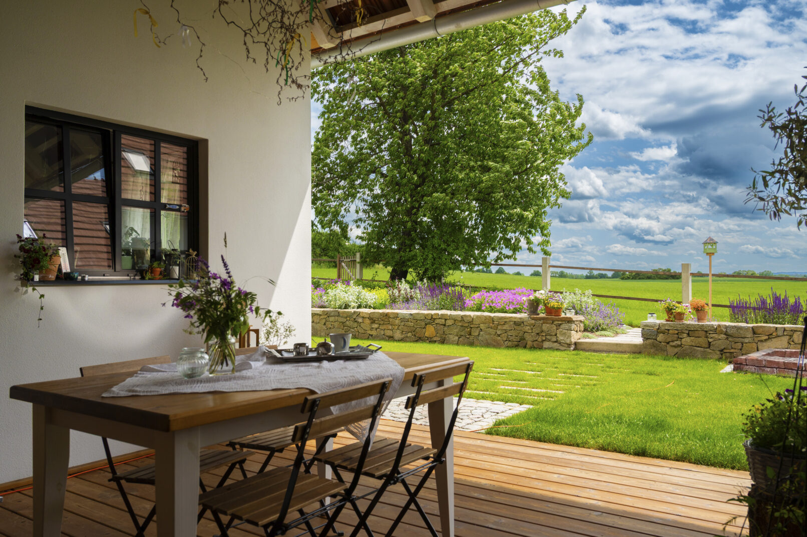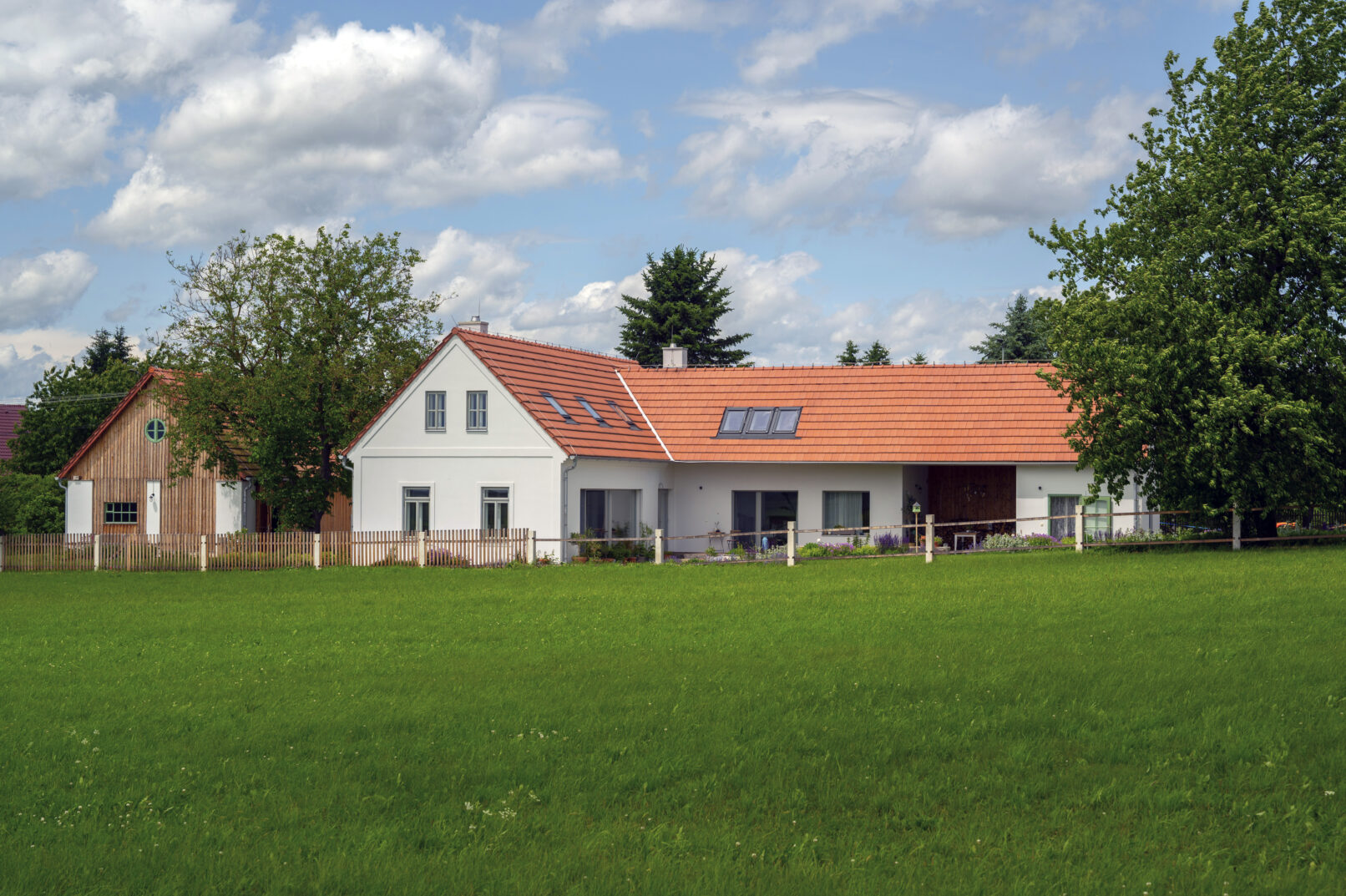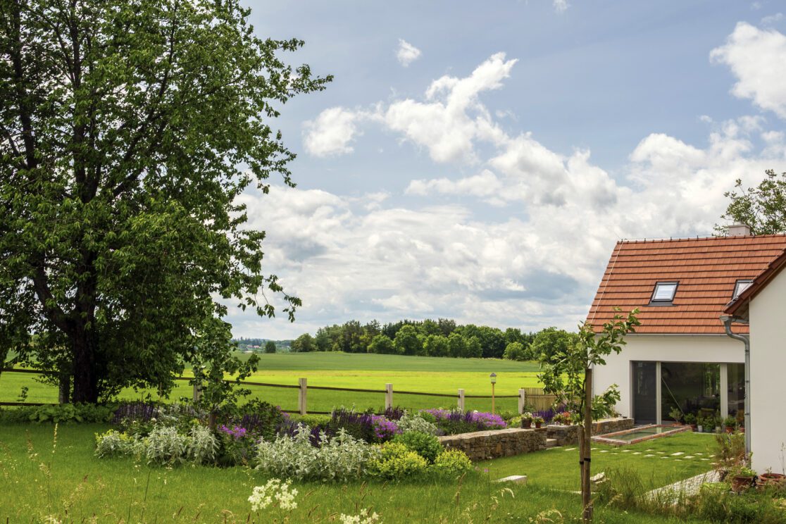 Patio mezi domem a zahradním domkem nabízí pohled na zvlněnou krajinu, kterou jemně rámuje jednoduchá ohrada.