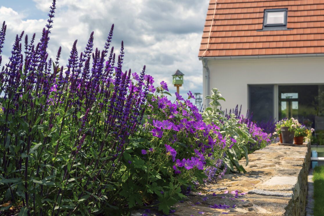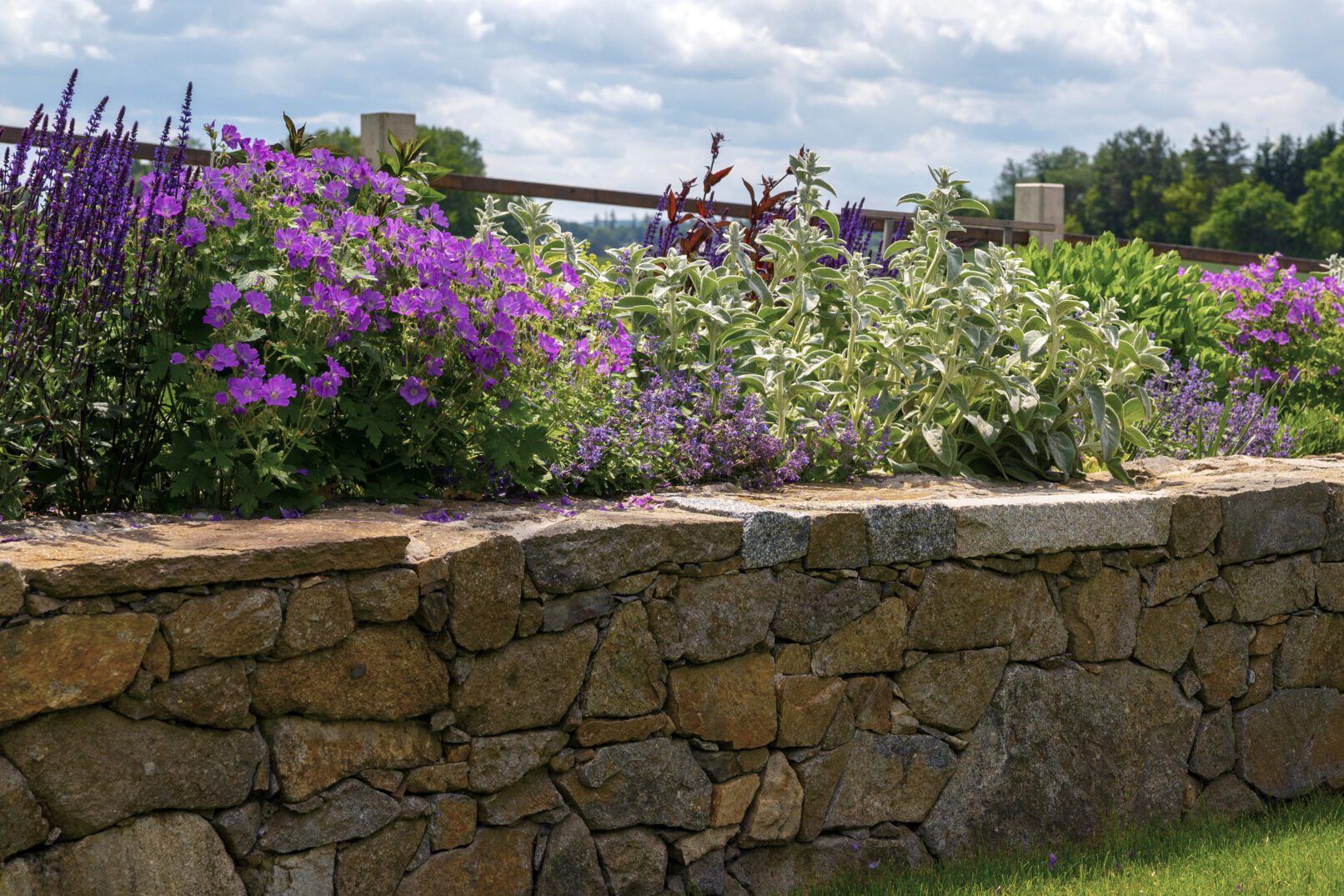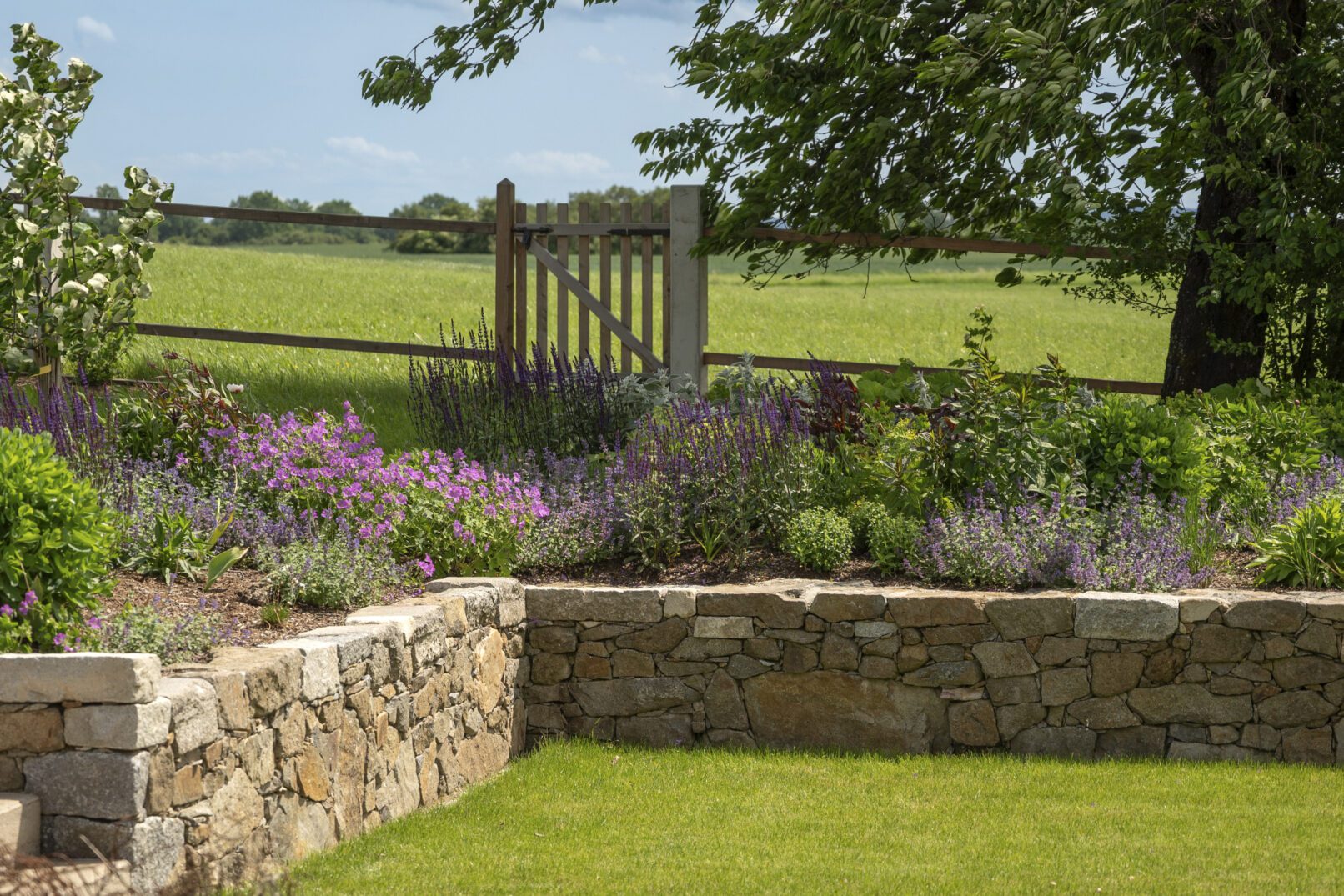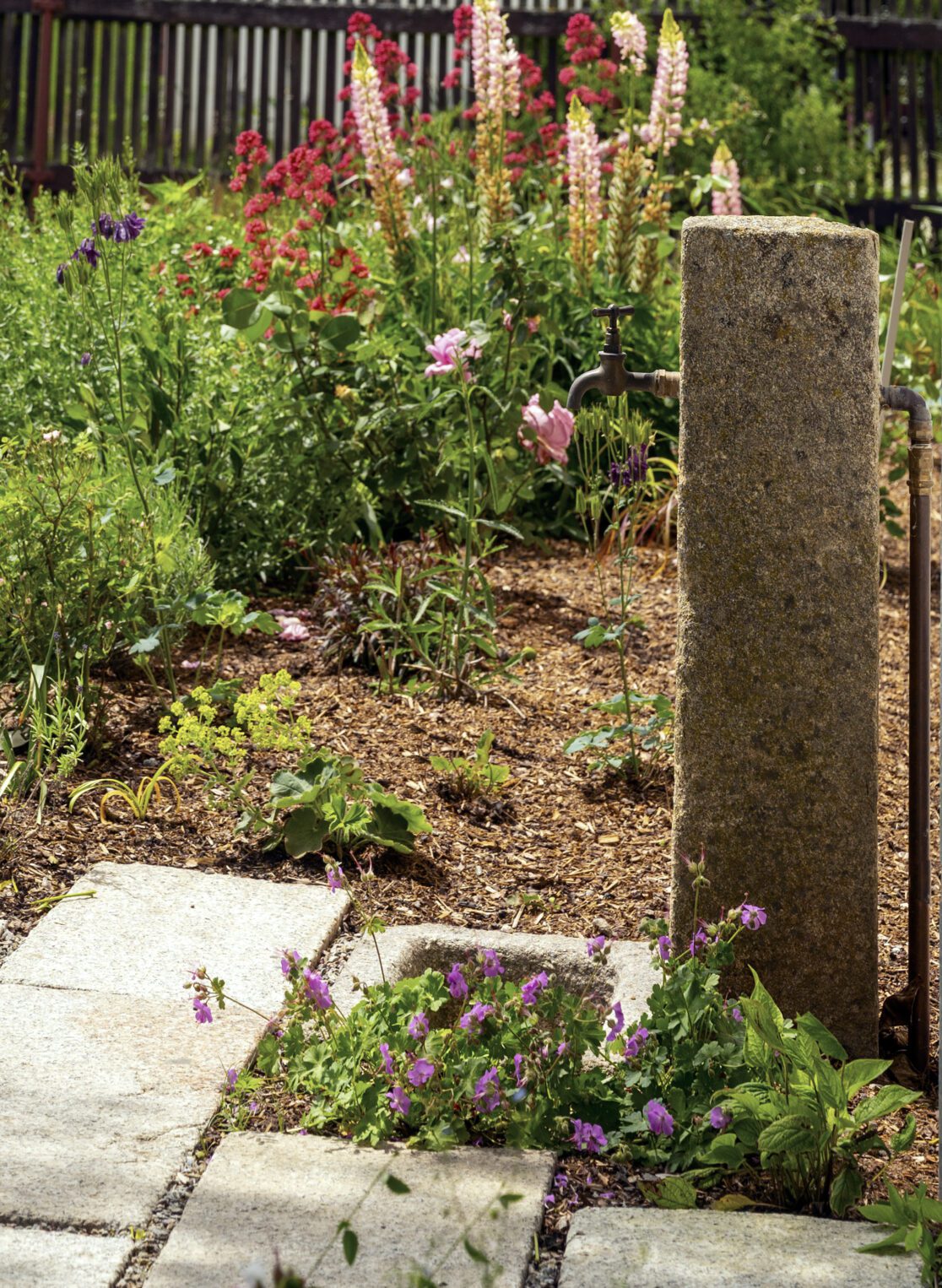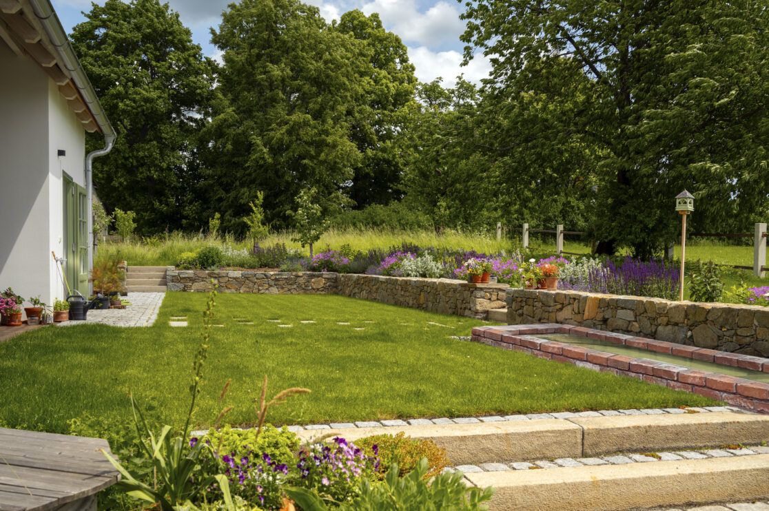 Hlavní část zahrady je ohraničena kamennou zdí, doplněnou cihlovým vodním prvkem a rabatovým záhonem.